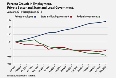 Look no further than Congress for the reasons why this is the case. Last year, Congress refused to put in place the American Jobs Act, which would have helped to reduce unemployment and create jobs. By not acting Congress and the states are instead cutting off the long-term unemployed from any additional benefits and shrinking government spending. While the private sector has been adding jobs for 27 months, for a total of 4.3 million jobs since February 2010, state and local governments have been shedding workers in most months since the fall of 2008, for a total loss 660,000 jobs. These layoffs are pro-cyclical, meaning that they are dragging down economic growth.