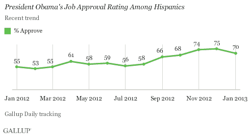 In January, 70% of Hispanics approved of the job President Barack Obama was doing, down slightly from 75% in December. However, the January measure still represents an increase of 12 percentage points since last August, just prior to the Democratic National Convention.